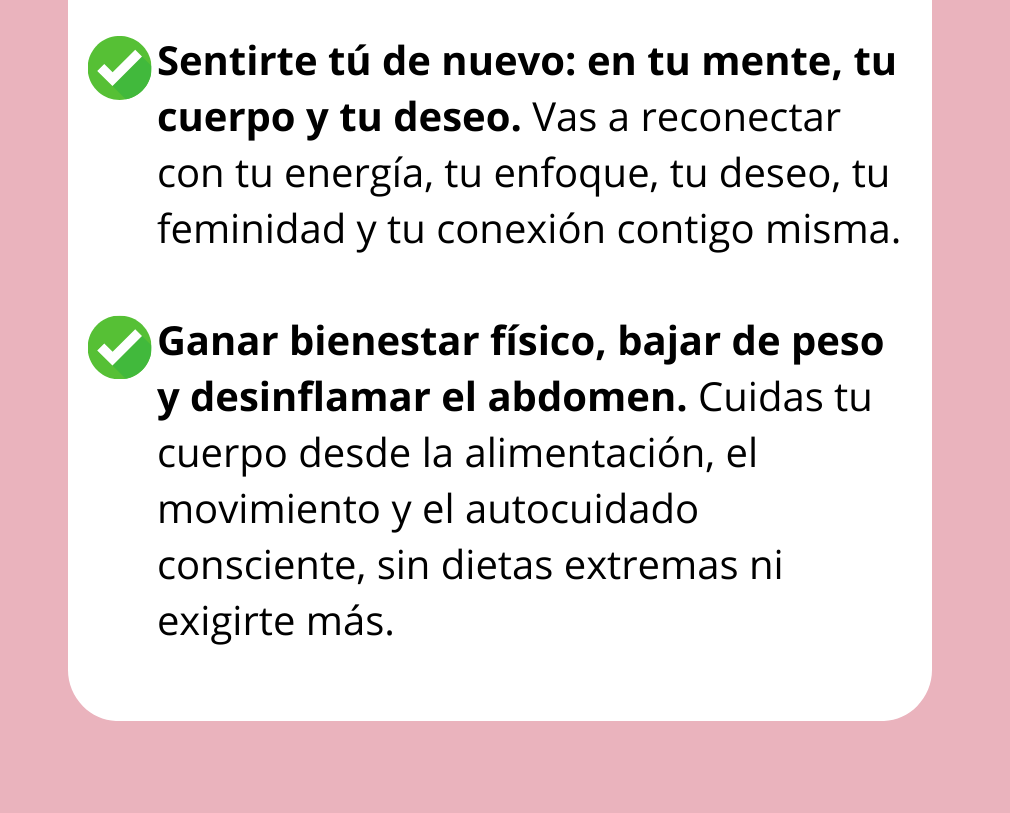 No. Esta guía está diseñada para acompañarte con alimentación, hábitos y bienestar emocional basados en evidencia, pero no reemplaza el acompañamiento médico o profesional individual cuando sea necesario.