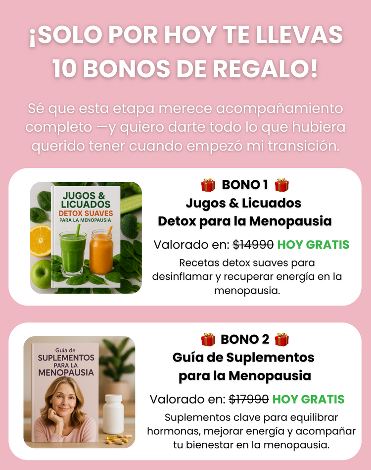 Vas a recibir el ebook Menopausia en Calma en formato digital PDF, más todos los bonos exclusivos incluidos en esta oferta especial (recetarios, plan de 21 días, plantillas, guías y recursos de apoyo).